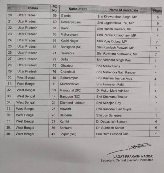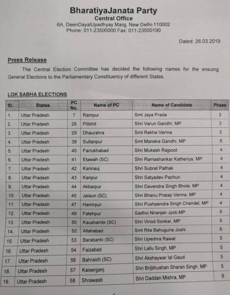 The seats of Union Minister Maneka Gandhi and her son Varun Gandhi were swapped as the BJP has fielded Maneka from Sultanpur while Varun is fighting from Pilibhit. Also, Ram Shankar Katheria has been given ticket from Etawah.