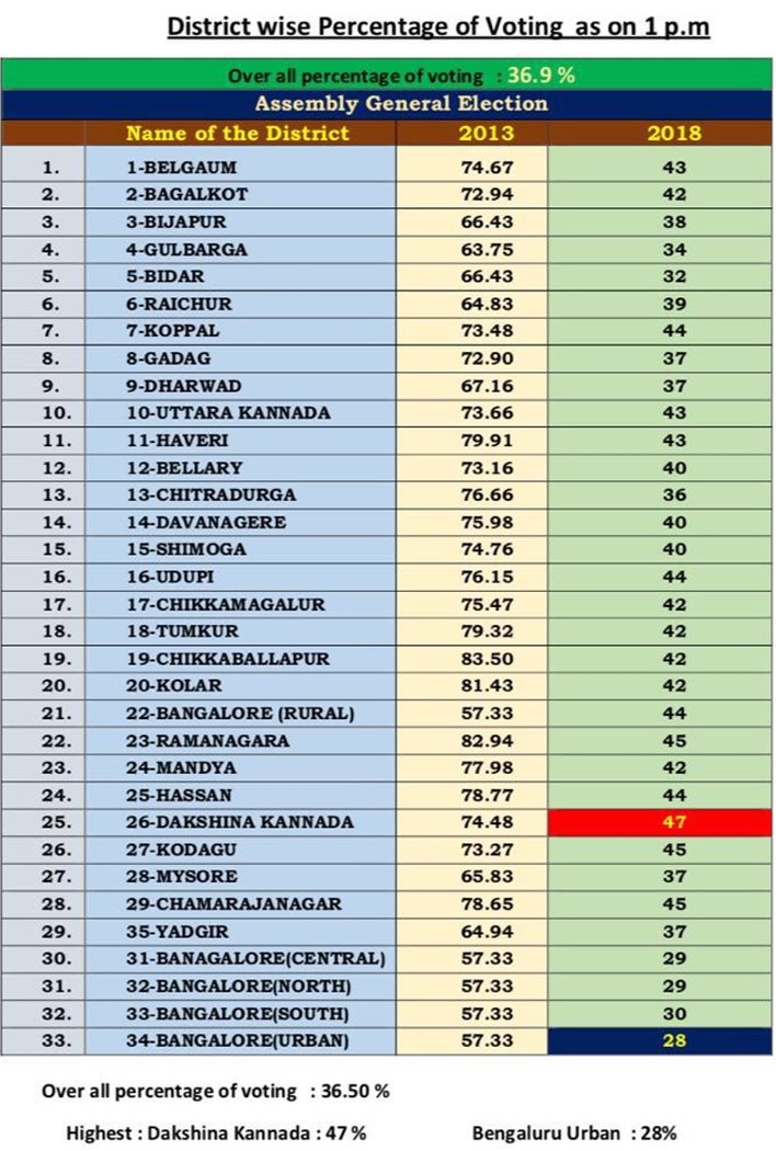 Till 1 pm, the highest polling was seen in Dakshina Kannada district at 47 per cent. In 2013, the constituency saw 74.48 per cent voting. Bengaluru Urban, which has a reputation of lower turnout, saw just 28 per cent of voters turning out till 1 pm.