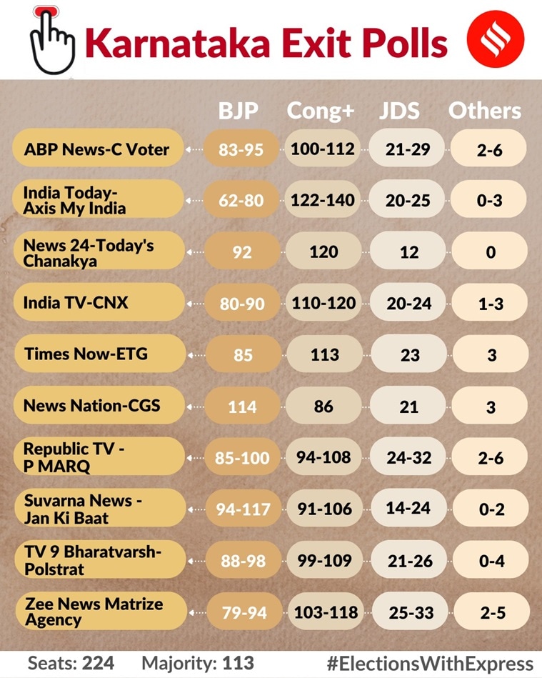 Exit Poll 2023 Result, Karnataka Assembly Election Updates, May 10, 2023: In order to avoid any untoward incident on the day of counting of votes of the Karnataka Assembly election, the Bengaluru police Friday said Section 144 will be imposed in the entire district on Saturday. The clampdown will be in place from 6 am on Saturday to 12 am on Sunday alongside a prohibition on the sale of alcohol in the Bengaluru police commissionerate region. Follow Karnataka election counting day updates here With most of the exit polls showing the Congress having an edge over the ruling BJP in the recently-concluded Assembly elections in Karnataka, all eyes are now on the counting of votes tomorrow. Karnataka Congress president D K Shivakumar on Friday denied having any alliance talks with the JD(S). "Exit polls have their own theory. We don't go by those samples, my sample size is too high and in that, we will have a comfortable majority. I do not know about JD(S), let them take their own call," he said while talking to ANI. The exit poll results started trickling in soon after voting concluded on the evening of May 10. At the end of the day, a majority of the exit polls ended up predicting Congress 's win - with three of them even giving the grand old party a clear majority over the ruling BJP. According to India Today-Axis My India exit poll, Congress is expected to secure between 122 to 140 seats, while News24-Today's Chanakya exit poll has projected that the grand old party will win 120 seats. Only one pollster-News Nation-CGS- has projected that the ruling BJP would win majority in the 224-member House. Most of the polls predicted that the JD(S) may get 20-odd seats.