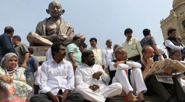 Congress and JD(S) leaders converged at Mahatma Gandhi’s statue near Vidhana Sauda, the state secretariat, to protest against the governor’s decision on Thursday. (Express photo by Johnson TA)
