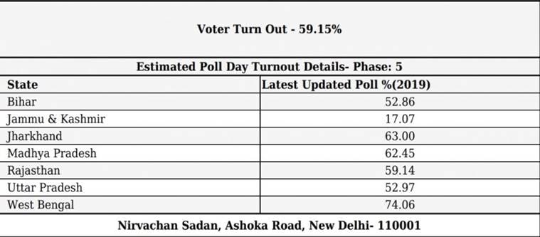 Fifty-one Lok Sabha seats across Uttar Pradesh, Rajasthan, Bengal, Bihar, Madhya Pradesh, Jharkhand, J&K recorded a voter turnout of 59.15% till 6 PM in the fifth phase of Lok Sabha elections today.