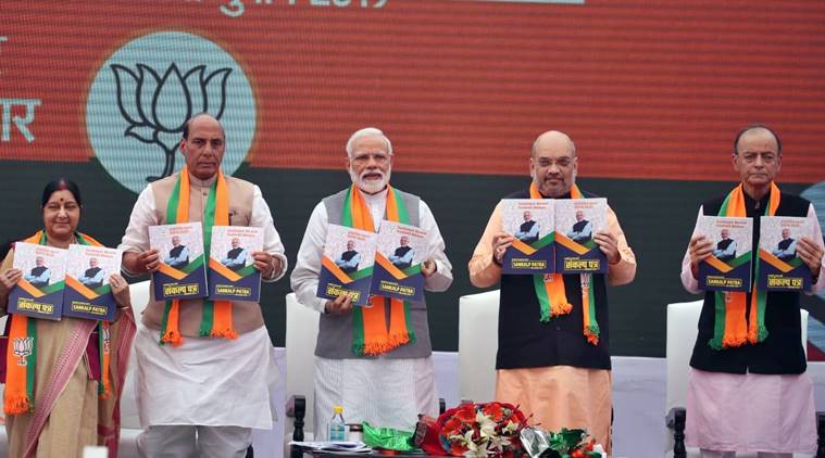 Prime Minister Modi, the only leader to figure on the cover of the 45-page document ‘Sankalpit Bharat, Sashakt Bharat’, released the Sankalp Patra at a function which was attended, among others, by party chief Amit Shah and senior ministers Rajnath Singh, Arun Jaitley, Sushma Swaraj. For the first time, party veterans L K Advani and M M Joshi were missing from the dais.
