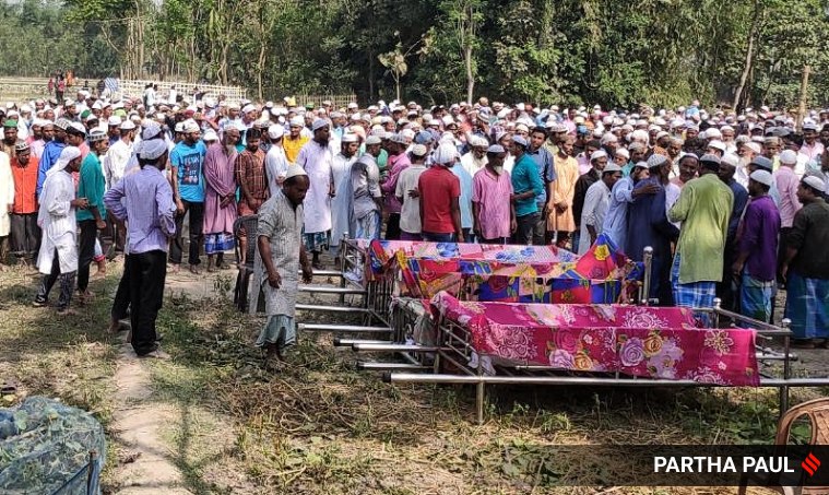 Over a thousand people took part in the last rites of the four youths who died in CISF firing in Sitalkuchi on Saturday. (Express Photo: Partha Paul)