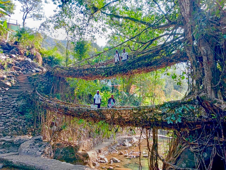 ? A team headed to Nongriat polling station of Shella assembly constituency in East Khasi Hills district trekked 6,000 steps to reach its destination located near the scenic root bridge, meanwhile, election officials had to row a boat to reach the Amlarem constituency's Kamsing polling station, which has only 35 voters. Some teams used the traditional Khasi basket 'khoh' to carry the EVMs and other items. (PTI)