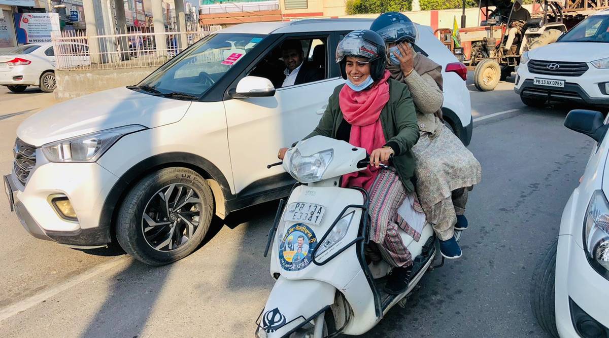 AAP’s Narinder Bharaj came on her mother’s scooty to file her nomination from Sangrur (Express photo)