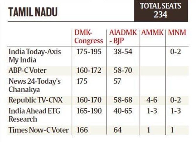 Tamil Nadu Election Results 2021: The DMK and its allies, including the Congress, are ahead in over 150 seats, while the ruling AIADMK is up in close to 80 seats in the Tamil Nadu election results. In the 234-seat House, a party needs at least 118 seats to win the election. The AIADMK, which has been in power since 2011, hopes to extend its hold on the state for another term. The Opposition DMK, on the other hand, is hoping a mixture of incumbency and instability within the ruling party will allow it to return to the helm of affairs after a decade. This election is the first in the state without two of Tamil Nadu's towering political figures, M Karunanidhi and J Jayalalithaa. The gap they left in the political arena has given rise to other fronts over the last few years. While the National Democratic Alliance, led by AIADMK, and Secular Progressive Alliance, led by DMK, hold sway over 70-80 per cent of the voter base, the others in the fray this election included an alliance led by TTV Dhinakaran's Amma Makkal Munnetra Kazhagam (AMMK) and one by actor-turned-politician Kamal Haasan's Makkal Needhi Maiam (MNM). So far, neither party has significant gains. All the exit polls have predicted a clean sweep for the DMK, with one even giving the alliance up to 195 seats. Get state-specific election result updates for West Bengal, Kerala, and Assam.
