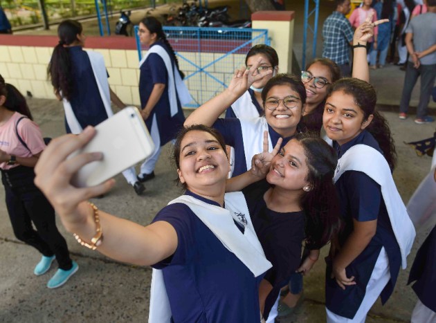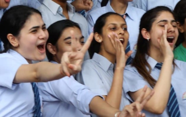 Students celebrate after the announcement of ICSE Board Class 10 results, at Lt Atul Katarya Memorial School in Gurugram, Sunday, July 17, 2022. (PTI Photo)