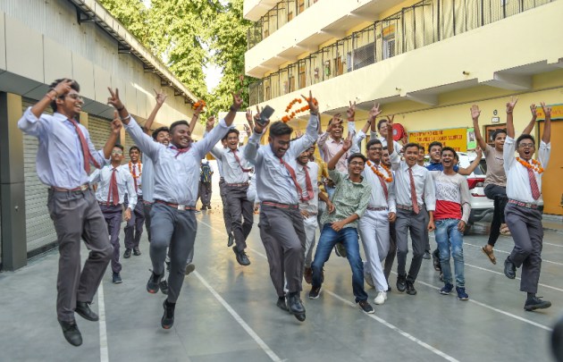 Eighteen students across the country are tied for the first rank with 99.75 per cent in the ISC examinations this year. In pic: Students celebrate after ISC Class 12th results at Satpaul Mittal School in Ludhiana. (Express Photos by Gurmeet Singh)