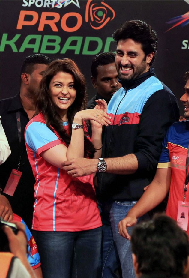 Abhishek and Aishwarya are seen cheering up during Pro Kabaddi match between Jaipur Pink Panthers and Puneri Paltan in Jaipur. (Source: PTI)