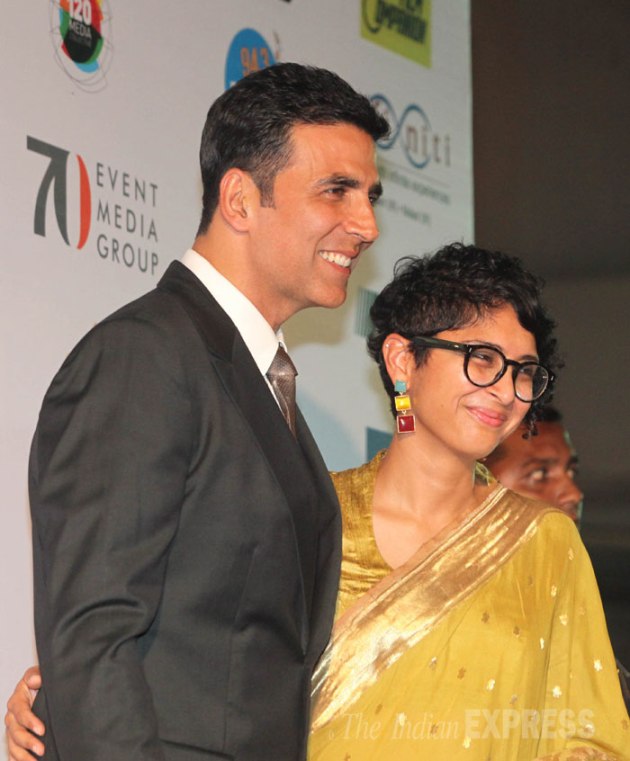Akshay Kumar poses with the very beautiful Kiran Rao. Kiran was radiant in a yellow sari. (Source: Express Photo by Dilip Kagda)