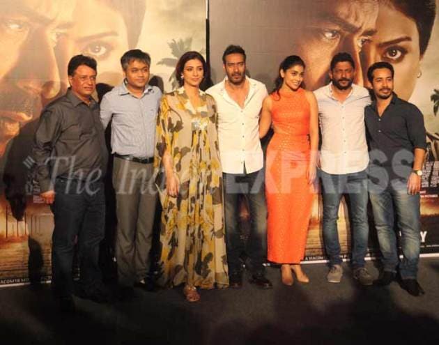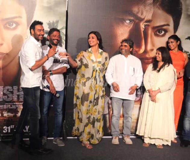 The leading actors of 'Drishyam' pose with director Nishikant Kamat and Kumar Mangat and others. (Source: Photo by Dilip Kagda)
