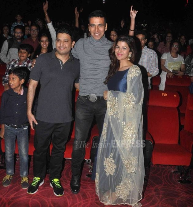 Akshay with Nimrat and T Series' Bhushan Kumar. (Source: Photo by Varinder Chawla)