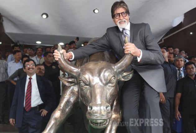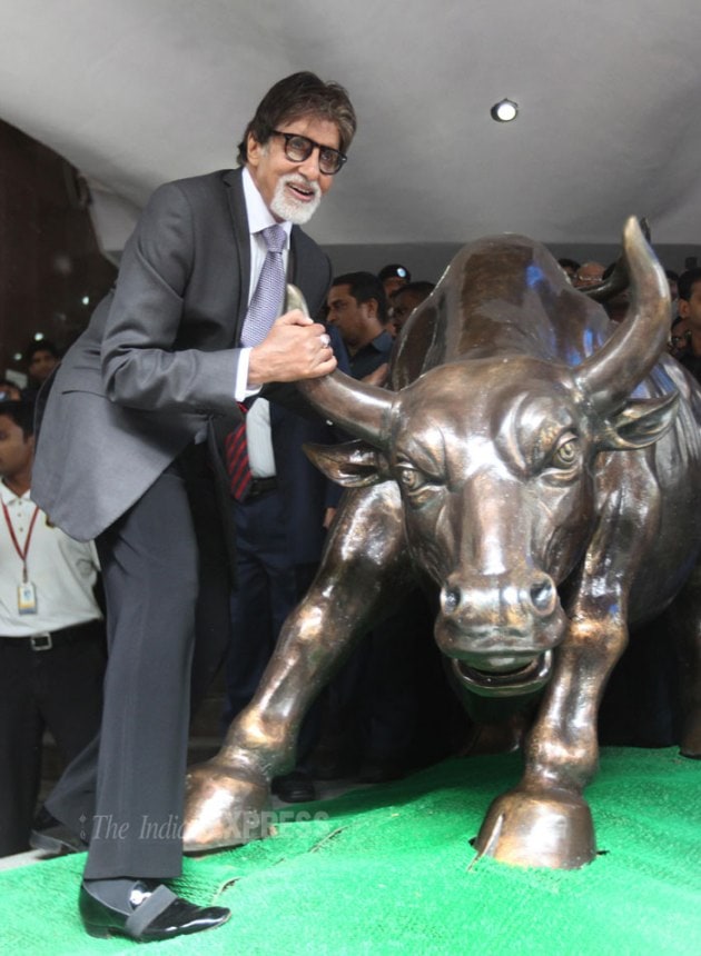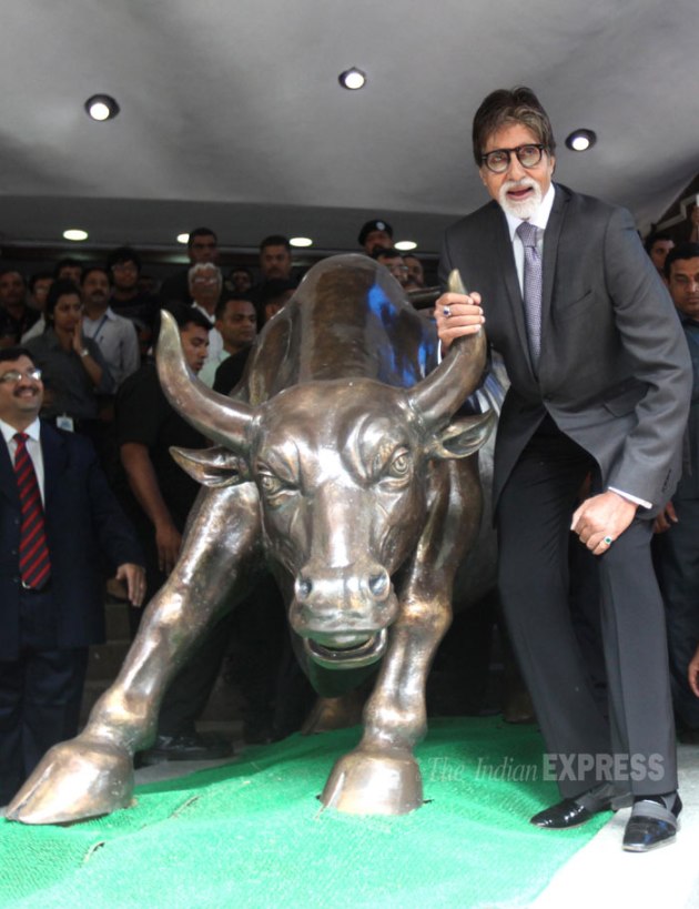 “Rung the Bell at the Bombay Stock Exchange and held the horns of the 'Bull..promotion for #YUDH..thank you BSE for this honour !” tweeted Amitabh Bachchan. (Source: Express photo by Pradeep Kochrekar)