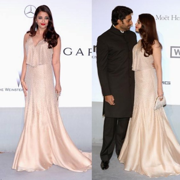 Aishwarya won nods of approval for her gown selection and no doubt looked divalicious, so much so that even hubby Abhishek couldn't keep his eyes off her. (Source: Twitter)