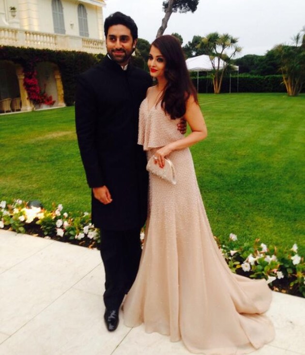 Aishwarya Rai Bachchan was stunning in a shimmery champagne coloured Armani Privé couture gown while Abhishek was dashing as ever in a black bandhgala long jacket. (Source: Twitter)