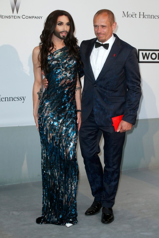 Austrian singer Conchita Wurst was no less glamourous in a shimmery sequined gown as she posed with Gary Keszler. (Source: Reuters)