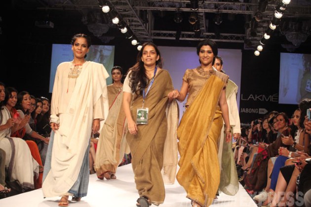 Bengali beauty Konkana Sen Sharma was another stunner that showstopped for Anvila Mishra in a metallic sari with yellow-gold and rust-gold blocking teamed with a gold metallic blouse. (Source: Express Photo by Dilip Kagda)