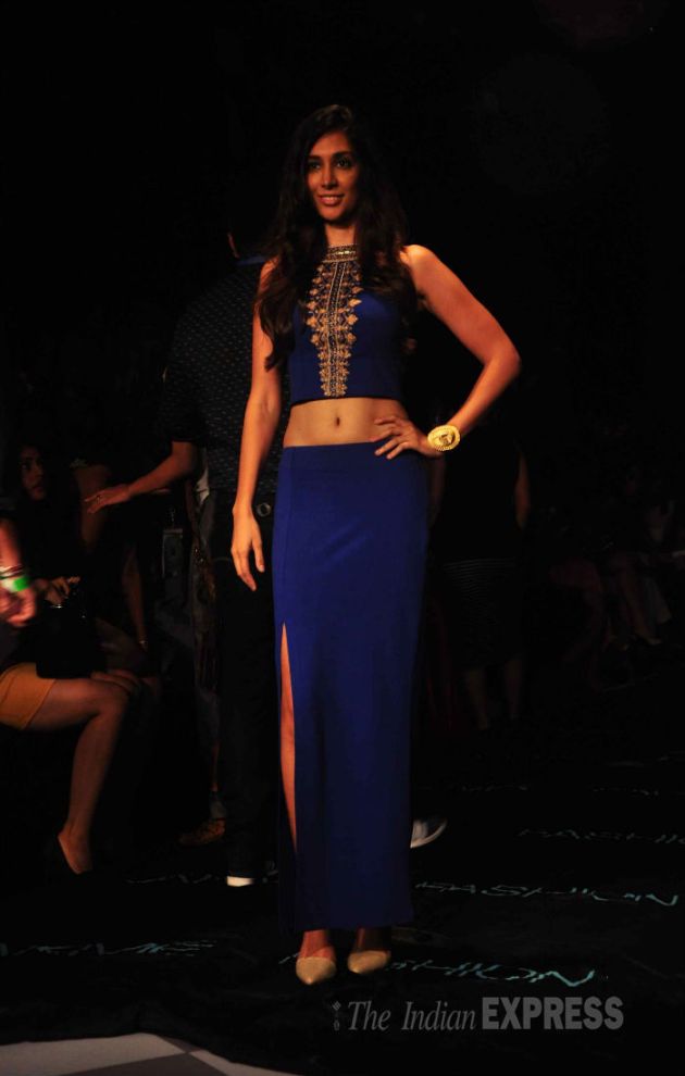 Salman Khan’s former ladylove Sangeeta Bijlani put in an appearance at the LFW looking beautiful in a midnight blue and gold floor-length maxi gown. (Source: Varinder Chawla)