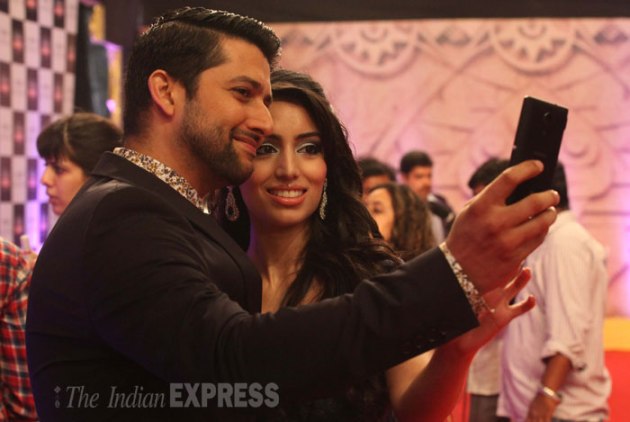 'Grand Masti' actor Aftab Shiivdasani takes a selfie with girlfriend Nin Dusanj. (IE Photo: Dilip Kagda)