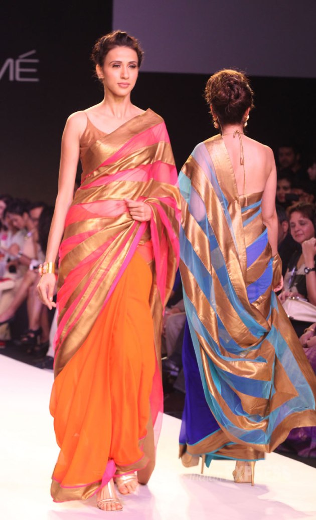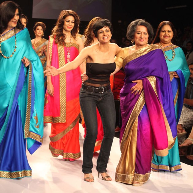 Making her maiden appearance at LFW 2014, Mandira, 41, showcased a beautiful feminine sari collection on the day two of fashion extravaganza. Seen here with her mother Geeta Bedi on the ramp (IE Photo: Dilip Kagda)