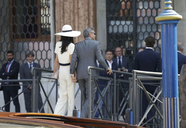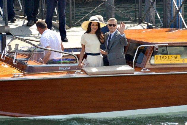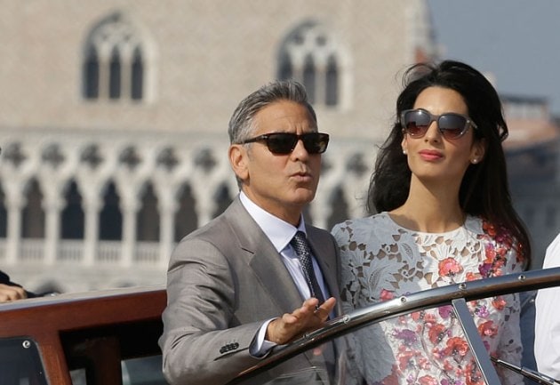 George Clooney, flanked by his wife Amal Alamuddin, waves from a water-taxi after leaving the city hall in Venice. (Source: AP)