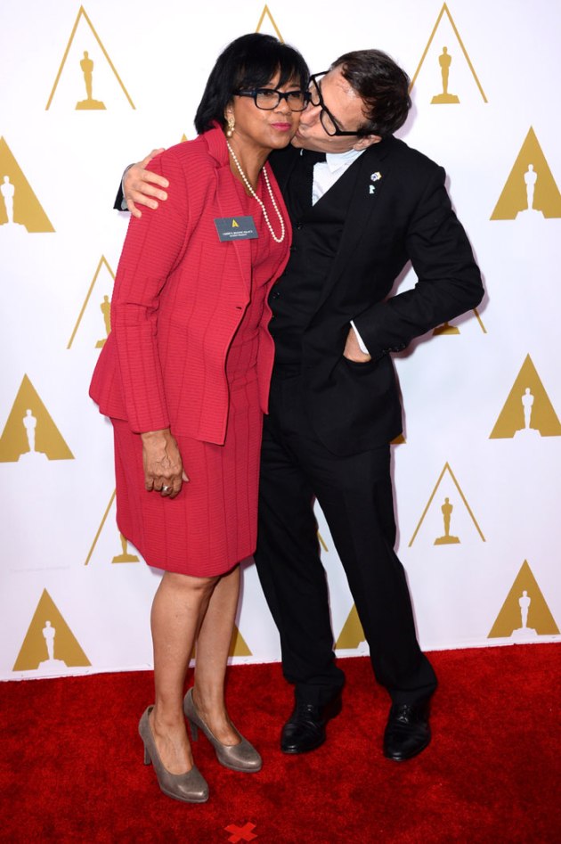 President of the Academy of Motion Picture Arts and Sciences, Cheryl Boone Isaacs and director David O. Russell share a candid moment at the red carpet. (AP)