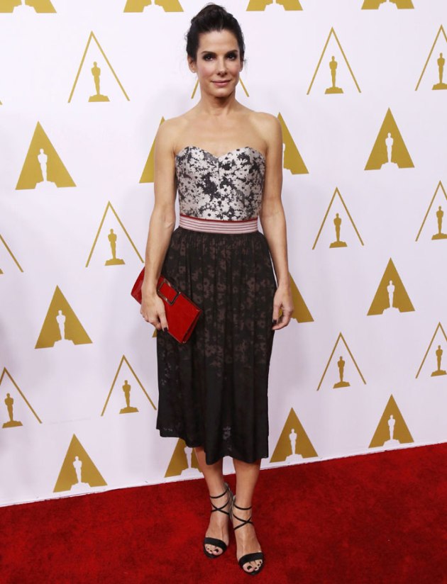 Oscar winner and nominee Sandra Bullock opted for a floral printed dress with different coloured top and skirt. She added colour to her look with red clutch. (AP)