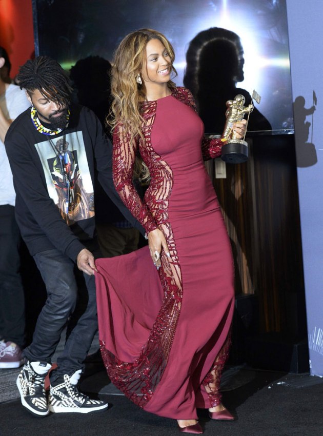 Singer Beyonce receives some assistance with her dress before posing backstage with her Video Vanguard Award during the 2014 MTV Video Music Awards in Inglewood, California. (Source: Reuters)