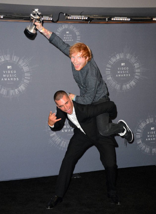 Emil Nava, left, and Ed Sheeran pose with the award for Best Male Video Award in the press room at the MTV Video Music Awards at The Forum on Sunday. (Source: Reuters)