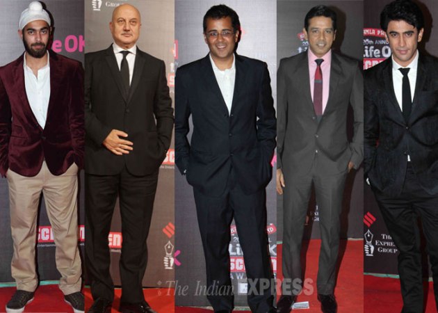 ‘Fukrey’ actor Manjot Singh sported a dark maroon jacket, Anupam Kher was suave in a suit and tie, Chetan Bhagat smiles for the camera, Anoop Soni was all suited and Amit Sadh was dapper in black. (IE Photo)