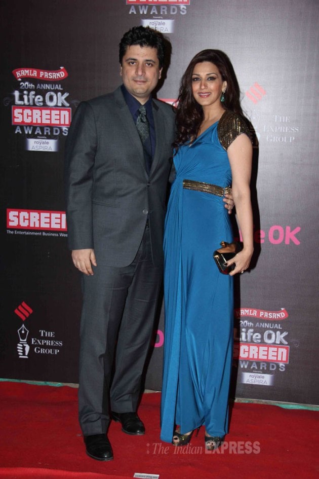 Actress Sonali Bendre was stunning in a blue gown with gold sleeves paired with a clutch and peep-toes to match as she arrived with husband Goldie Behl. (Photo: Varinder Chawla)