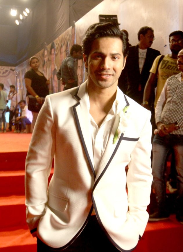 'Student of the Year' actor Varun Dhawan made an entrance in a white blazer with dark blue pants. (Photo: Dilip Kagda)