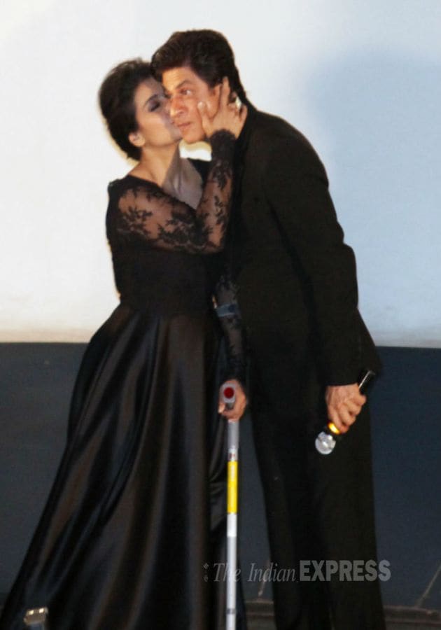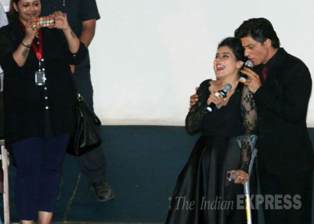 Shah Rukh Khan plays the perfect co-star as he supports Kajol who was leaning on her crutch as she enjoyed a laugh. (Source: Express Photo by Vasant Prabhu)