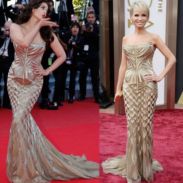 Bollywood actress Aishwarya Rai Bachchan has been garnering praise for her golden look at the cannes Film Festival this year. Everyone, including her husband Abhishek Bachchan, is going gaga over her look. But Ash's winner look has apparently been picked out from another actress' wardrobe. Broadway star Kristin Chenoweth wore the same gold strapless Roberto Cavalli gown to this year's Academy Awards. But, copycat or no copycat, Aishwarya looked beautiful!