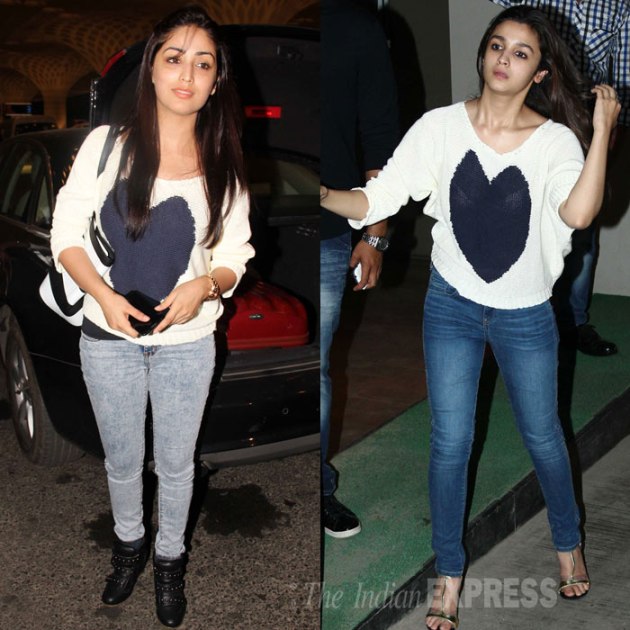 We saw pretty girl Alia Bhatt in a white sweater with a heart print for a screening of her film, '2 States' last week and we immediately liked it but a few days later, 'Total Siyappa' actress Yami Gautam was also snapped wearing the same sweater at the airport on her way to Tampa Bay for IIFA 2014. We believe, Yami's stylist needs to be more up-to-date on fashion, Yami are you listening? Ahead: Other copycats of Bollywood.