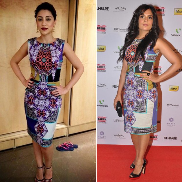 Amrita Puri from ‘Kai Po Che’ rocked this printed Etro dress at a party. The updo made the whole look extremely graceful with the dark lips. Gangs Of Wasseypur actress Richa Chadda later wore the same dress at an award nominations party. However she chose to wear minimal makeup and let down her hair.