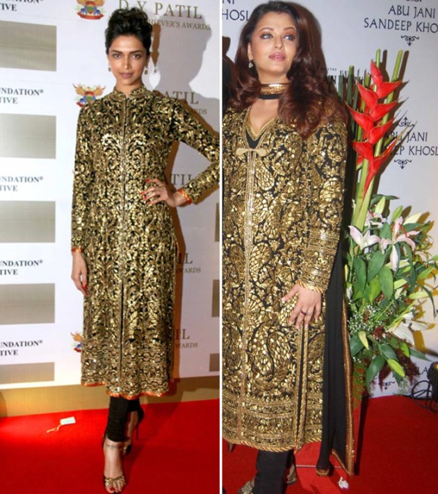 Aishwarya Rai Bachchan also seemed to have provided Deepika Padukone with a few ideas. The yum mum wore a gold embroidered Abu Jani Sandeep Khosla churridar suit to the anniversary celebration of the designers. Later that same week, Deepika Padukone was spotted wearing the same creation at an award function.