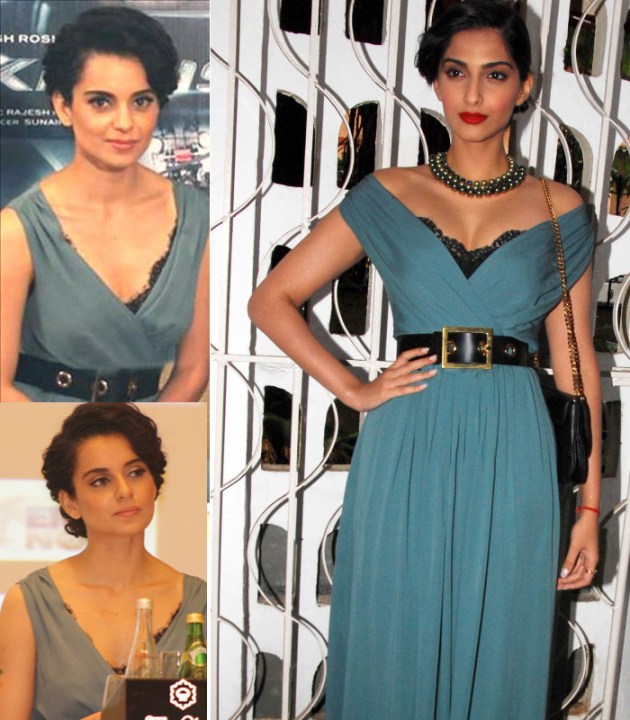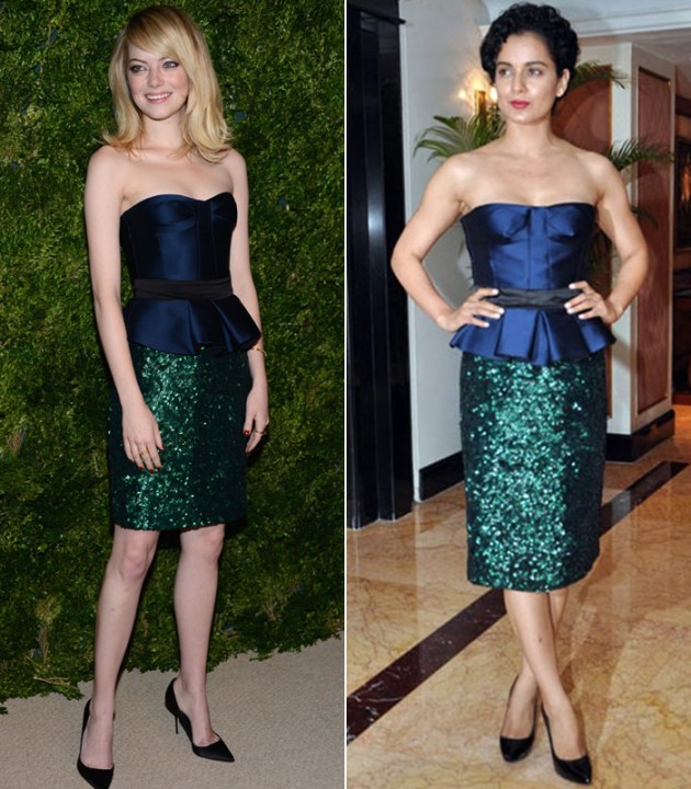 'Queen' actress Kangana Ranaut, who has now carved a niche for herself in the fashion circle, often borrows her look form Hollywood's fashionistas. Here, Kangana opted for a sequin blue-green Burberry dress copying actress Emma Stone.
