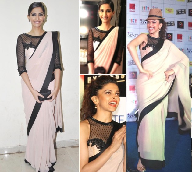 Deepika Padukone wore a nude and black coloured Atsu sari to a film promotional event, a look that which was also worn by Sonam Kapoor.