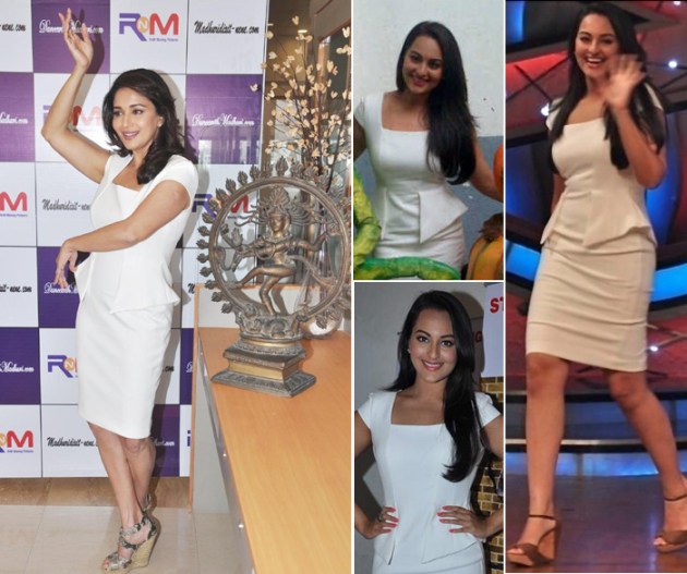Madhuri Dixit also went down the copycat lane when she wore this immaculate white Zara dress to her website launch that was previously worn by Sonakshi Sinha on the sets of a reality dance show.
