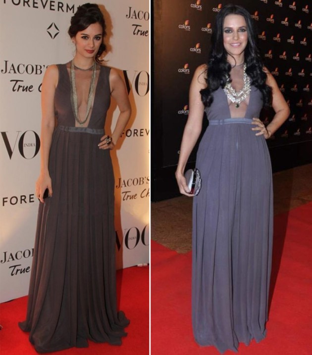 Pretty girl Evelyn Sharma stunned in a nude coloured Sailex maxi dress at a magazine bash. Actress Neha Dhupia who also did justice to the creation was later snapped wearing it to another television channel party.