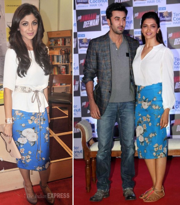 Both Deepika Padukone and Shilpa Shetty were spotted wearing a blue printed midi Zara skirt with white blouses. However, while Deepika chose to style it more casually with flats, Shilpa went chic in nude coloured heels.