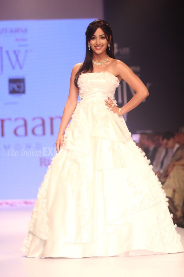 Bride on the ramp! Yami’s gown resembled a white-layered wedding gown. (Source: Varinder Chawla)