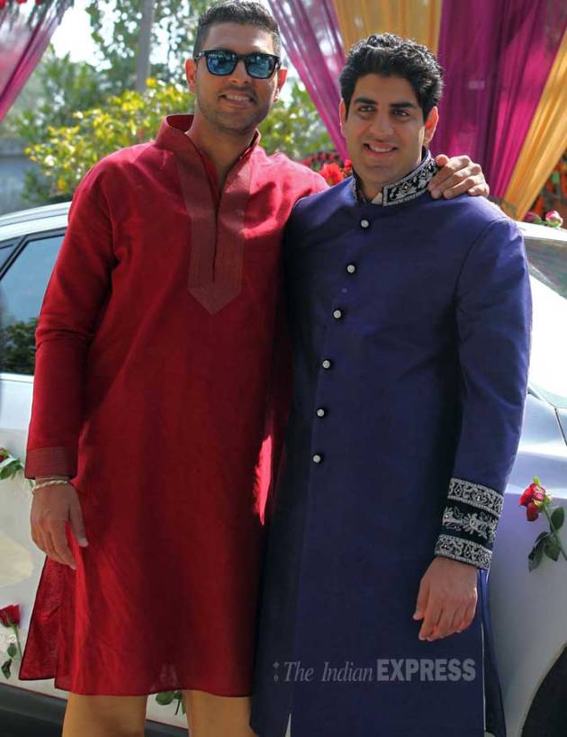 Zorawar was suave in the blue sherwani and Yuvraj was dapper in the bright red kurta for the wedding function. (IE Photo: Kamleshwar Singh)