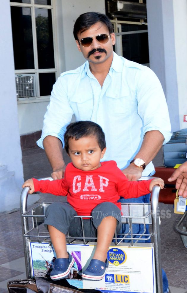 Actor Vivek Oberoi arrived at Jodhpur Civil Airport on Thursday (November 27) along with his wife Priyanka and son Vivaan in tow. The tiny tot enjoyed riding in the luggage trolley. (Source: Express Photo)