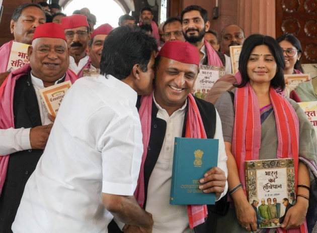 This is the first session after the Lok Sabha elections 2024, which were held in seven phases from April to June. In the picture, Congress leader Rahul Gandhi and other INDIA bloc leaders show copies of the Constitution of India during their protest at the Parliament House complex. (PTI)