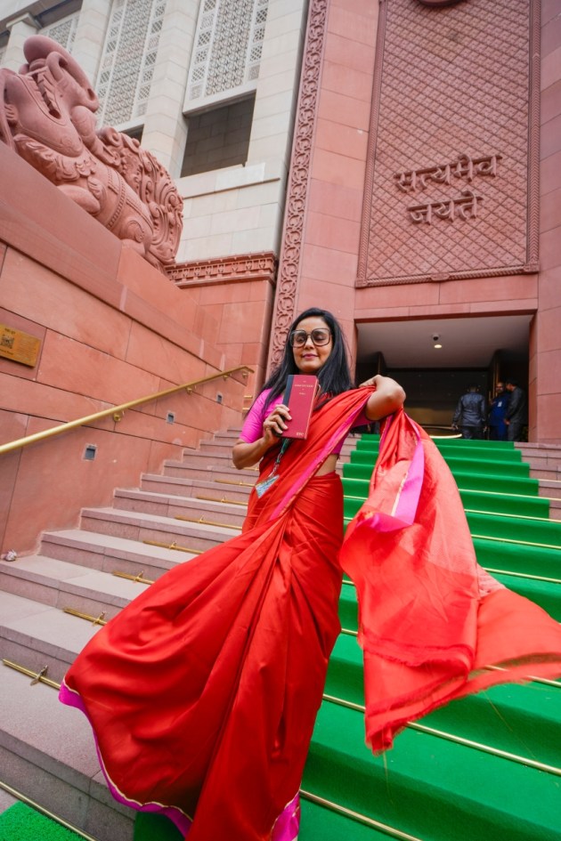 TMC MP Mahua Moitra holds a copy of the Constitution of India at the Parliament House complex on the first day of the first session of the 18th Lok Sabha, in New Delhi, Monday, June 24, 2024. (PTI Photo)