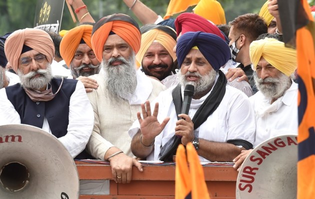 Shiromani Akali Dal (SAD) chief Sukhbir Singh Badal with party leaders and supporters held a protest march from Gurdwara Rakabganj Sahib to Parliament Building to observe "black friday" on completion of one year of their protest against the Centre's three farm reform laws, in New Delhi. (Photo: PTI)