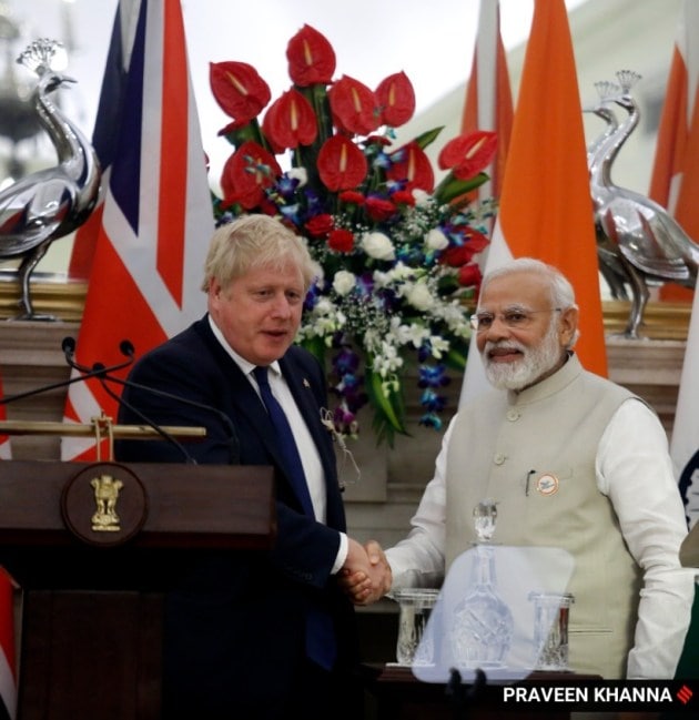 Calling Prime Minister Narendra Modi his “khas dost” (special friend), British Prime Minister Boris Johnson Monday said that India and the United Kingdom are on path to sign a free-trade agreement by Diwali this year. (Express photo by Praveen Khanna)