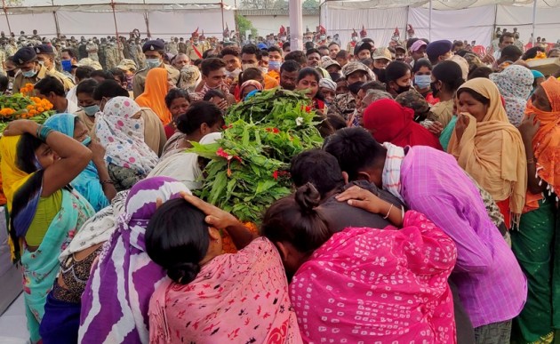 Relatives mourn around a coffin of a security force personnel, who was killed in an attack by Maoist fighters, during a wreath laying ceremony in Bijapur (Reuters)